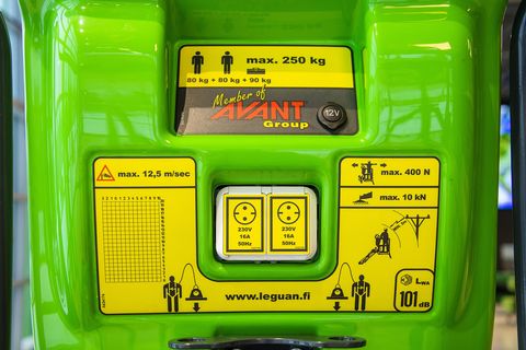• Arbeitskorb: Für 2 Personen ausgelegt, mit 230 V und 12 V-Steckdosen für Werkzeuge und Geräte.