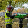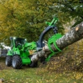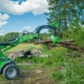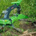Der neue schwere Holzgreifer ist aufgebaut mit einem stärkeren Arm, einem hydraulischen Rotator und einem größeren Greifwinkel. Speziell für den Einsatz an der 700- und 800-Serie. Der Distanzhalter am Arm vorne montiert gehört zum Standard. Beim Baumfällen kann man den Baum auch damit wegdrücken, wenn es notwendig ist. Damit entfällt das Drücken von Hand. Es ist auch möglich, Seile daran zu verspannen, um den Baum zu ziehen.